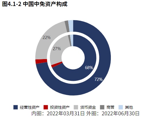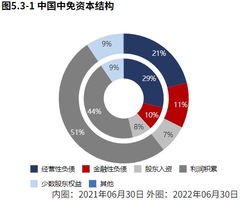 资金来源上表现出“造血”支撑度增加的趋势。从2022年06月30日中国中免的负债及所有者权益结构来看,公司的资本引入战略为以利润积累为主,辅之经营负债的并重驱动型。其中,利润积累是资产增长的主要推动力。与2021年06月30日相比,留存资本占比明显增长,经营性负债占比明显降低,公司在资金来源上表现出留存资本支撑度增加的趋势。