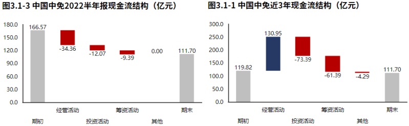 从中国中免2022半年报的现金流结构来看,期初现金166.57亿元,经营活动净流出34.36亿元,投资活动净流出12.07亿元,筹资活动净流出9.39亿元,累计净流出54.87亿元,期末现金111.70亿元。经营活动不具有造血能力。
