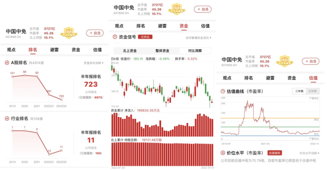 截至2022Q2,中国中免在A股的整体排名下降至第723位,在商贸零售行业中的排名上升至第11位。截止2022年10月13日,北上资金并无特别信号。以近三年市盈率为评价指标看,中国中免估值曲线处在偏低区间。
