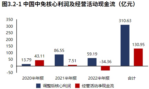 经营活动存在资金缺口。中国中免2022半年报经营活动现金净流出34.36亿元,较2022半年报减少41.87亿元,2020年报到本期经营活动累计产生净流入130.95亿元。经营活动虽然账面盈利,却没有真金白银的流入。