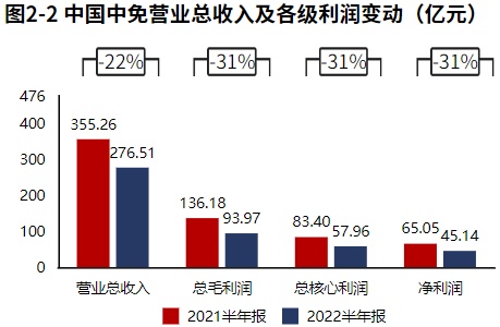 公司业绩大幅下滑。2022半年报中国中免营业总收入276.51亿元,同比增速-22%,毛利润93.97亿元,同比增速-31%,核心利润57.96亿元,同比增速-31%,净利润45.14亿元,同比增速-31%。