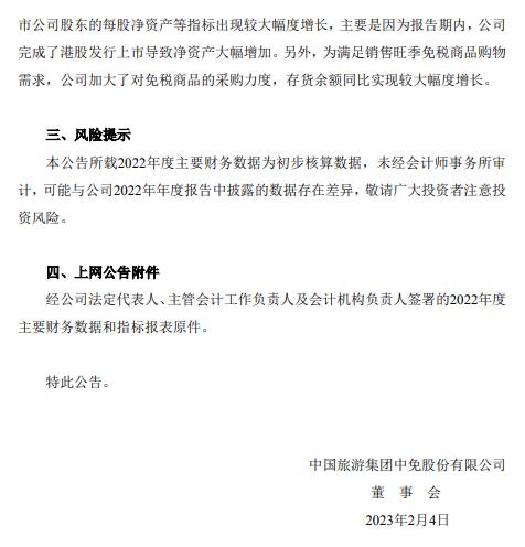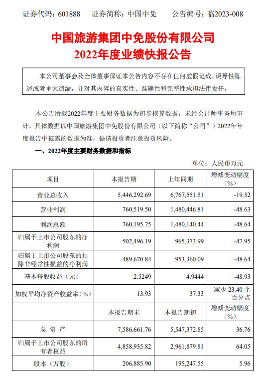 中国中免2月3日发布业绩快报,2022年,公司实现营业总收入544.63亿元,同比下降19.52%;实现营业利润76.05亿元,同比下降48.63%;实现归属于上市公司股东的净利润50.25亿元,同比下降47.95%。