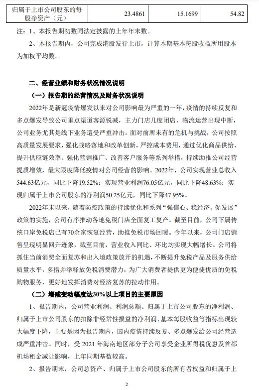 中国中免业绩快报:2022年净利润50.25亿元 同比下降47.95%