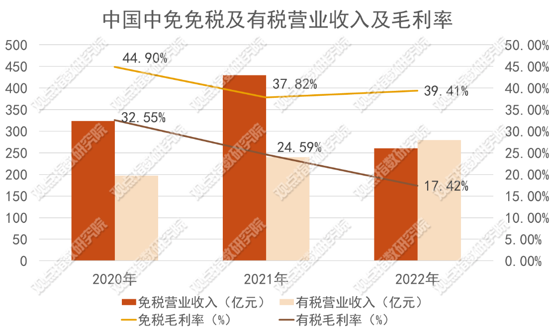 而由于业务模式的区别,有税业务的毛利率比免税要低很多,大概在20%-30%左右的水平,2022年的最新毛利率为 17.42%。而免税业务的毛利率最高能接近45%,2022年最新毛利率为39.41%。