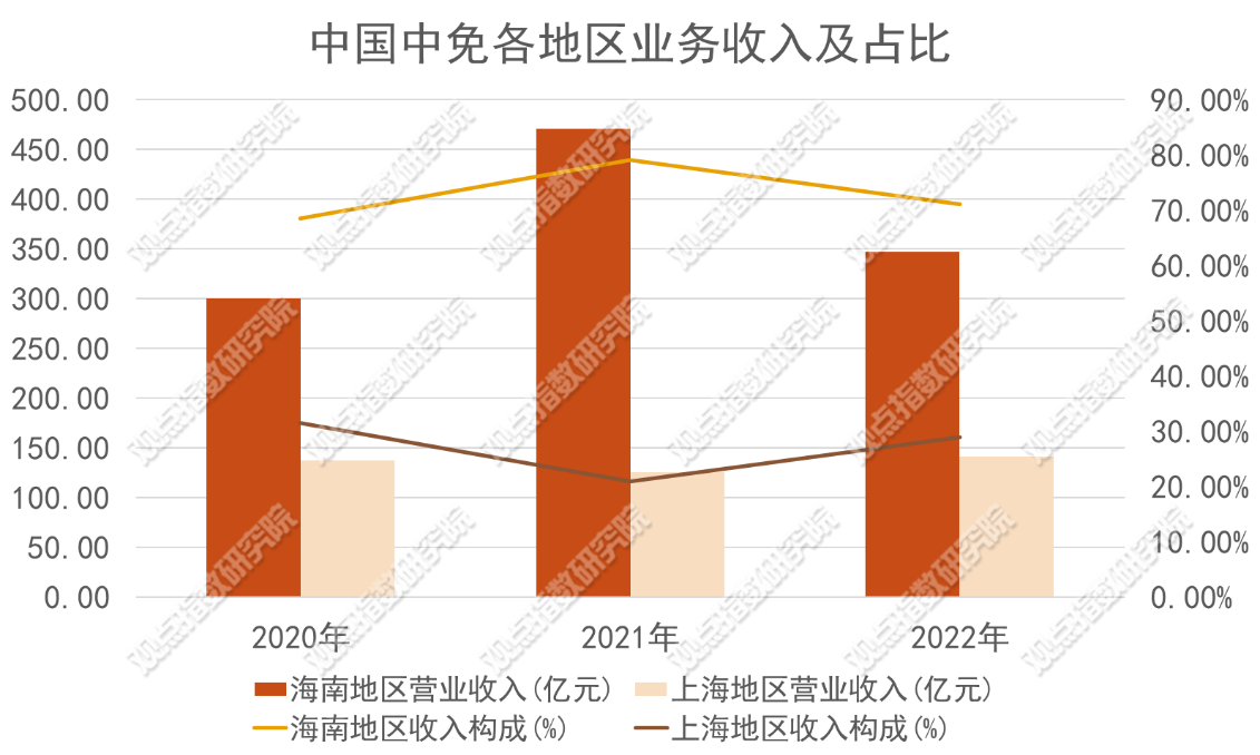 从中国中免近年地区收入情况来看,海南地区始终占据重要的地位,收入占比一直稳定在7成左右,2022年海南地区的收入录得347.05亿元;与之相对的是上海地区,录得141.45亿元,占比接近3成。这也意味着中国中免业务收入增长,与海南商业市场的发展具有强关联性。