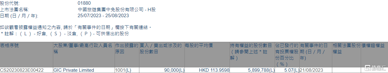 格隆汇8月25日丨根据联交所最新权益披露资料显示,2023年8月21日,中国中免(01880.HK)获GIC Private Limited在场内以每股均价113.9598港元增持9万股,涉资约1025.64万港元。