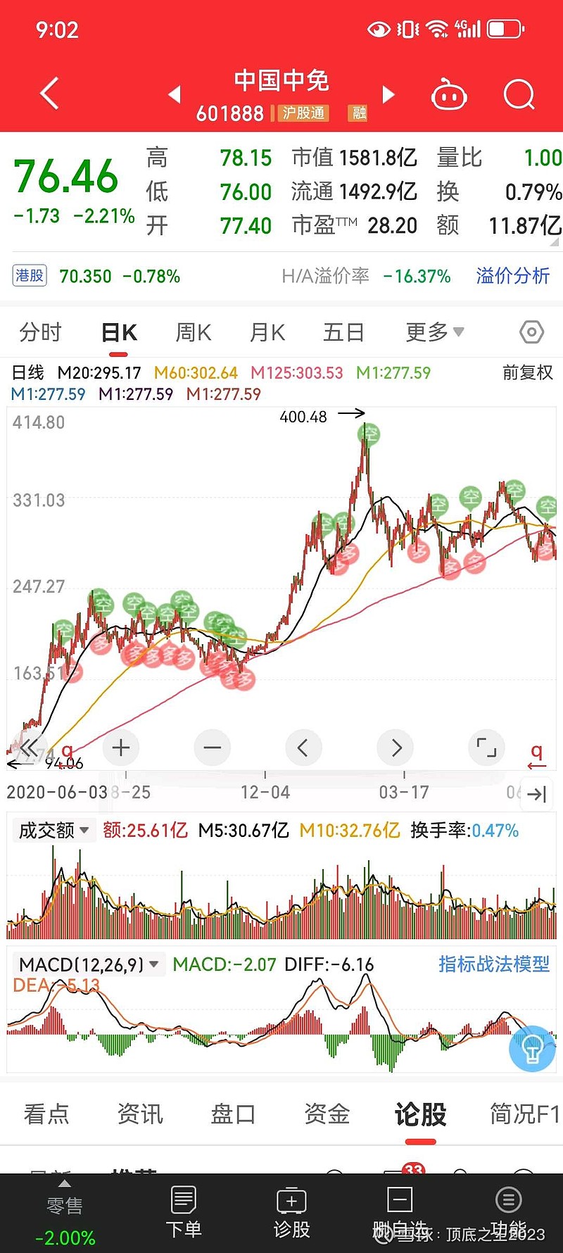 如果拉长时间看,中免本轮见顶时间在2021年2月18日,至今跌幅达到81%。