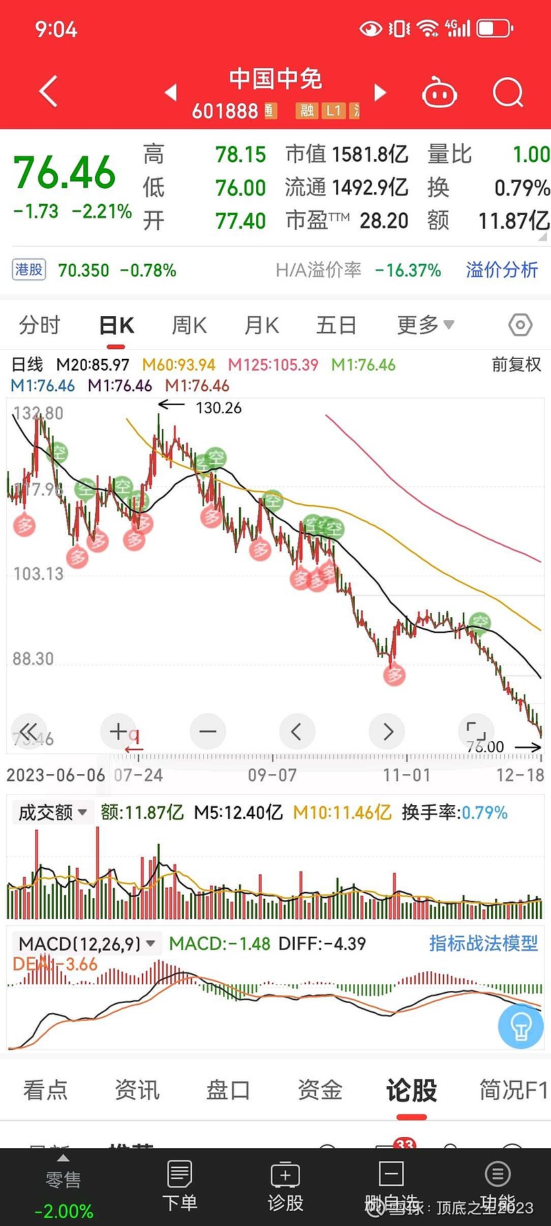疯狂之后,一路下跌。今年12月18日,中免再度跌,创下更名以来新低76。更为夸张的是,中免一直跌的很流畅,期间并无像样反弹。