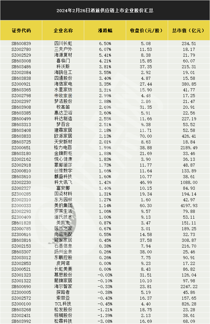 酒旅供应链个股方面,四川长虹(SH:600839)、三夫户外(SZ:002780)涨超6%,海源复材(SZ:002529)涨超5%,喜临门(SH:603008)涨超4%。