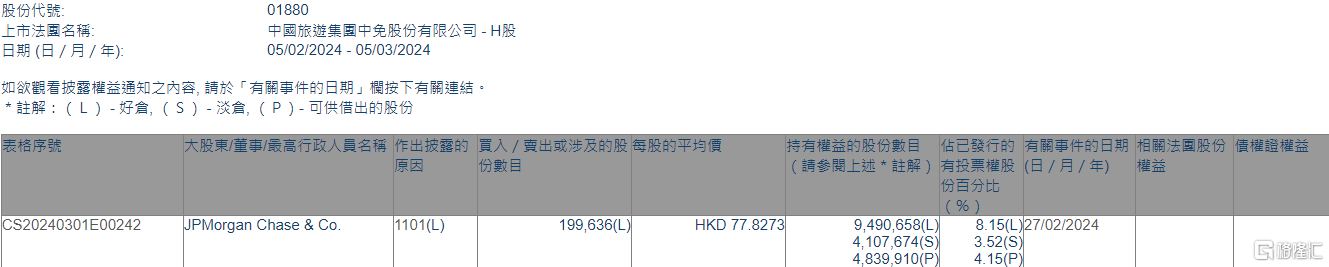 格隆汇3月5日丨根据联交所最新权益披露资料显示,2024年2月27日,中国中免(01880.HK)获JPMorgan Chase & Co.以每股均价77.8273港元增持好仓19.96万股,涉资约1553.71万港元。
