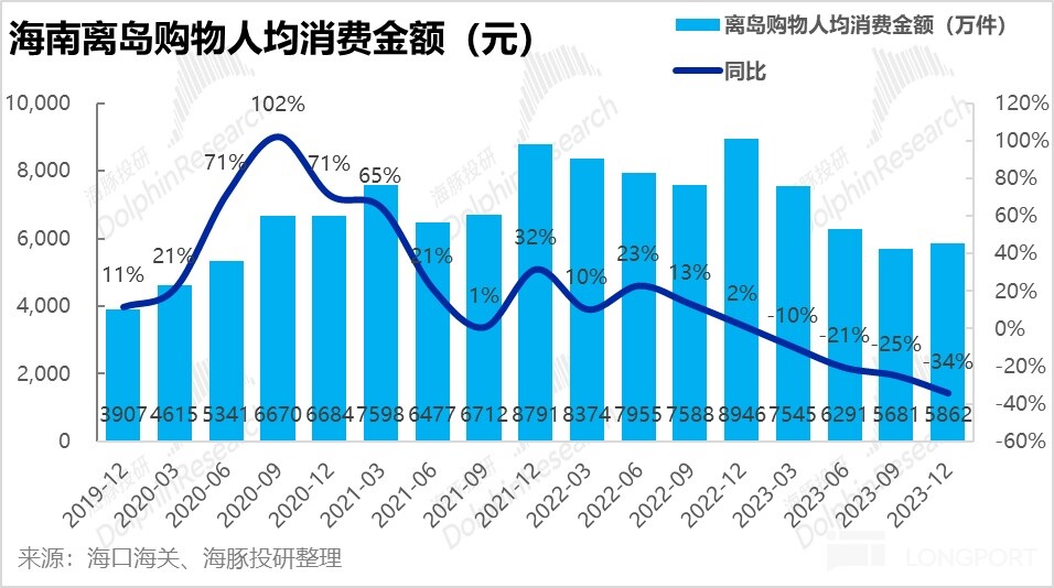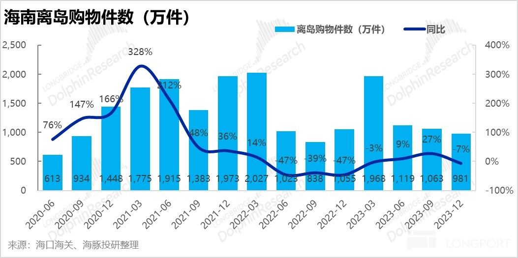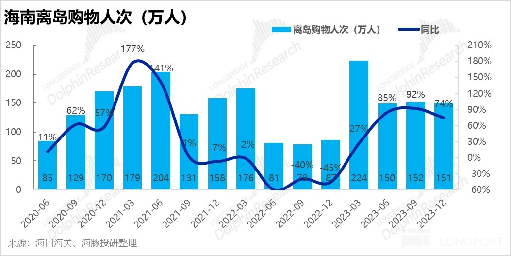 对比海南整体免税销售情况,四季度海南离岛免税的购物人次和消费金额环比三季度基本毫无变化,并未在免税消费的旺季展现出多少改善迹象。在去年的低基数下,海南整体免税销售仅增长了 14%,仍然是相当疲软。