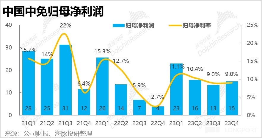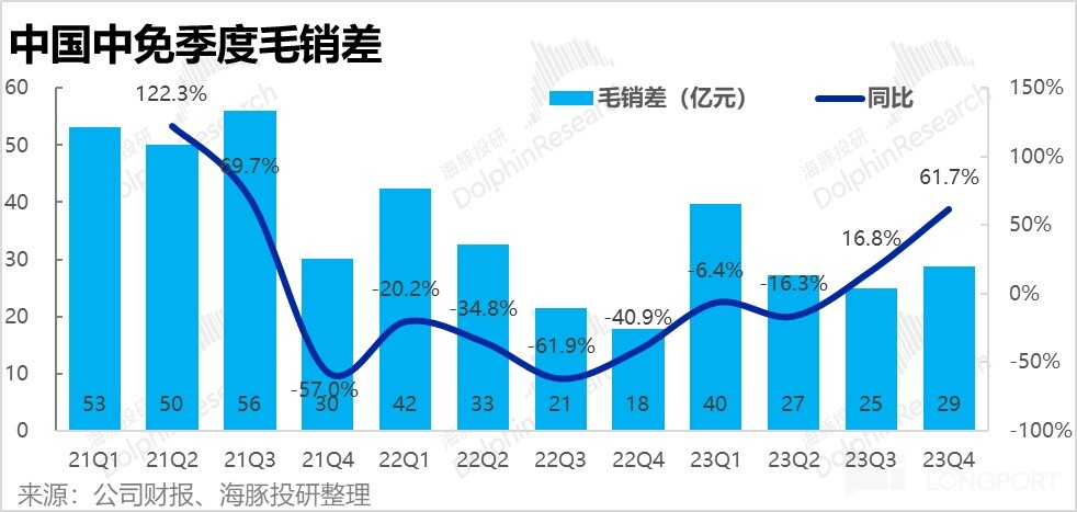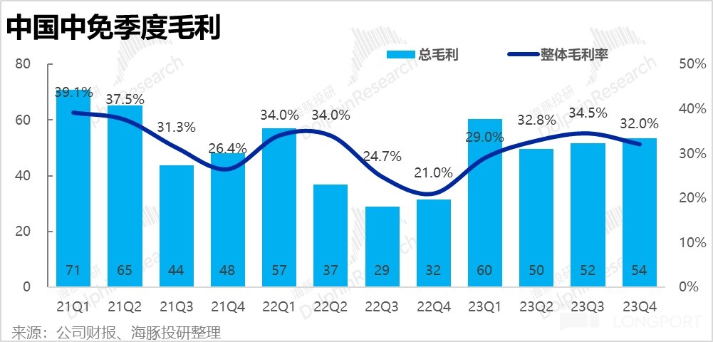 四季度中国中免实现毛利润 54 亿元,环比小增 2 亿。考虑营收是增长了 17 亿,毛利率是从 34.5%下降到了 32%。实际毛利润是比预期低了近 9%,并不喜人。