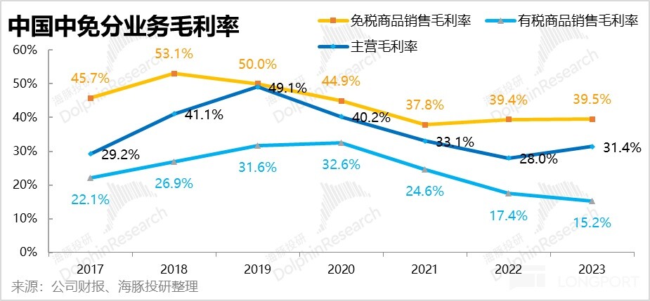 但分类型来看,2023 年免税销售的毛利润是 39.5%,相比去年实际是略微提升了 0.1pct。换言之,尽管今年的客单价是大幅下滑的,中免在免税品上的折扣率很有可能是缩窄了的。