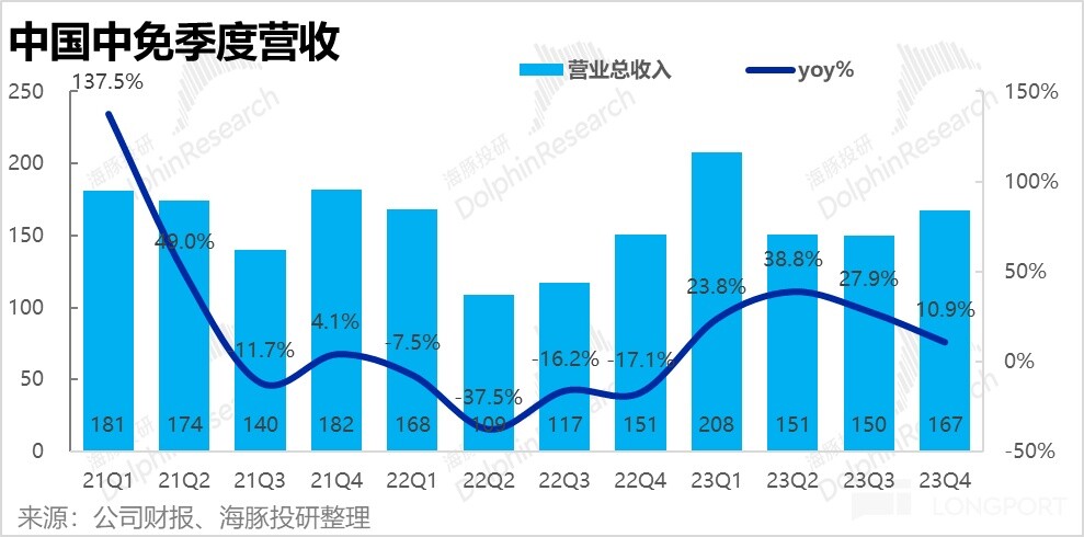 营收层面,中国中免 23 年 4 季度共实现营收 167 亿元,同比增长 10.9%,环比增长 11%。在传统季节性高点的 4 季度,公司营收规模在连续两个季度环比持平后,本季总算有所突破。