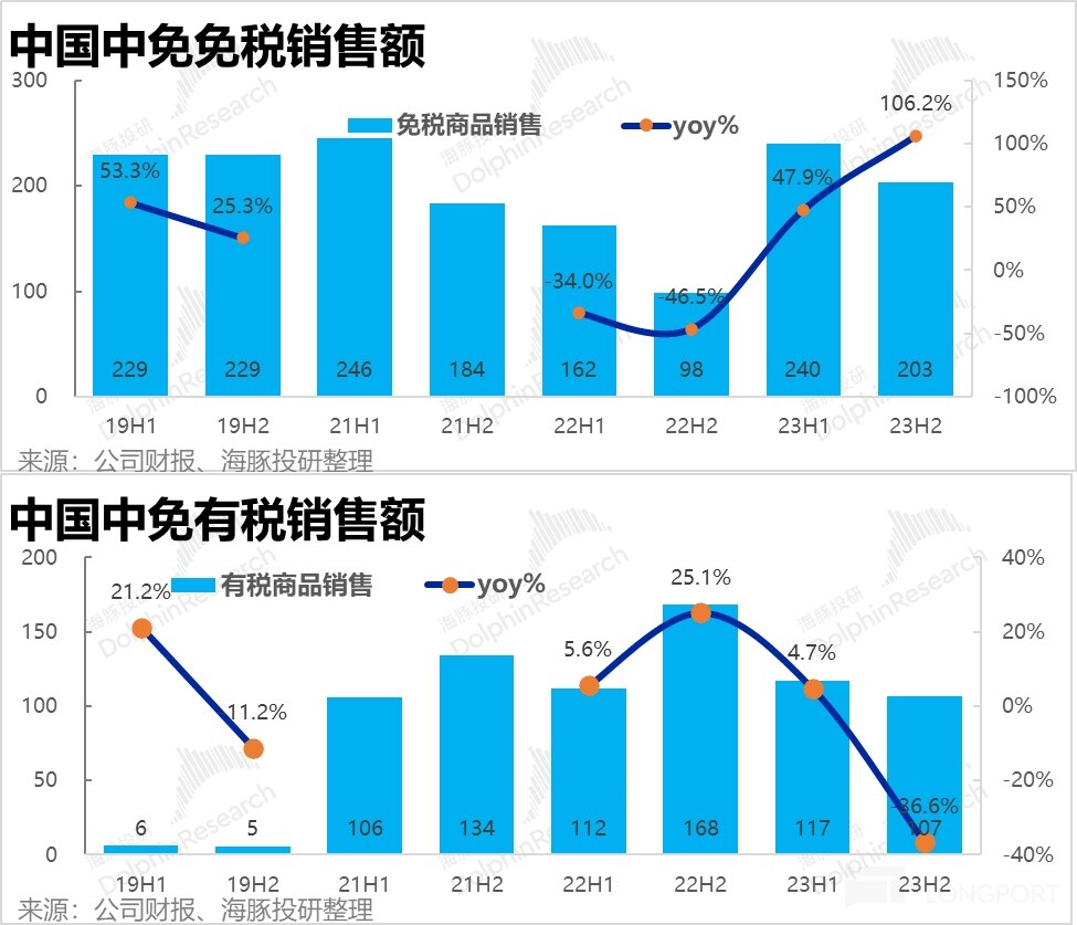 不过分销售类型来看,2023 下半年,公司免税品销售收入 203 亿元,有税销售为 107 亿元。虽然因去年低基数,免税销售同比大幅增长。但从绝对值看,下半年免税销售环比减少了约 37 亿(15.4% QoQ),有税销售则仅环比减少了 10 亿(8.5% QoQ),可见利润空间的免税销售还是相对偏弱。