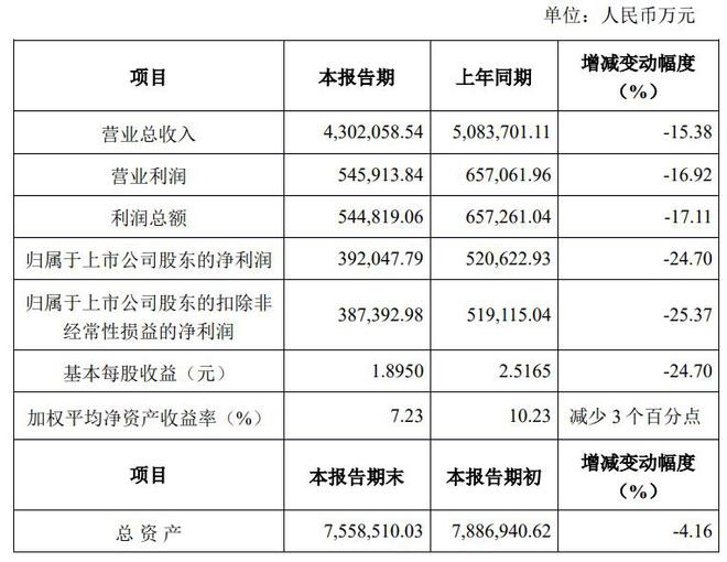 财报显示,前三季度公司实现营业收入430.21亿元,同比下降15.38%;实现归属于上市公司股东的净利润39.20亿元,同比下降24.70%。