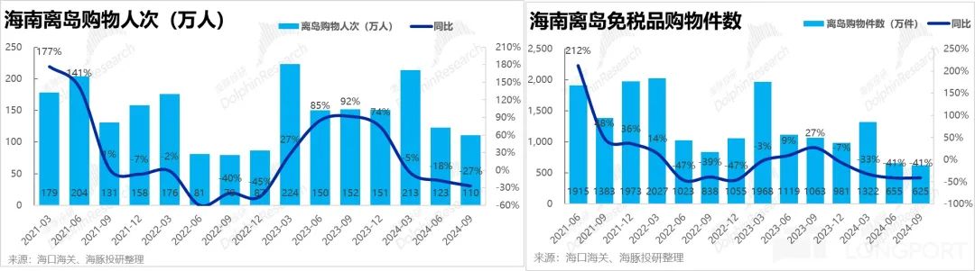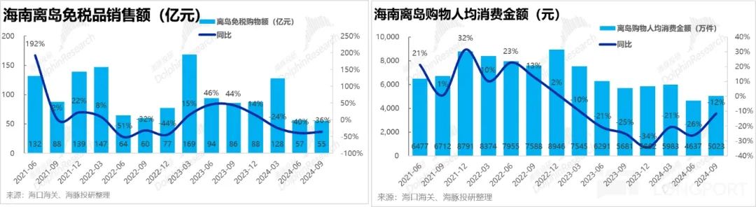 结合商务部公布的离岛免税销售数据,三季度购物人次同比下降了 27%,高于上季-18%的降幅,可见台风确实影响了消费者入岛消费。不过虽然人流下降,但受益于人均消费金额的触底回升,离岛免税消费额的同比降幅较上季实际是缩窄了约 4pct 到-36%。虽然绝对来看仍非常疲软,但边际上实际是稍有改善趋势的。