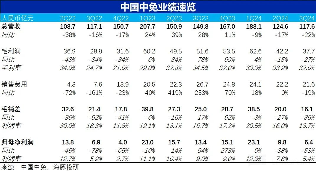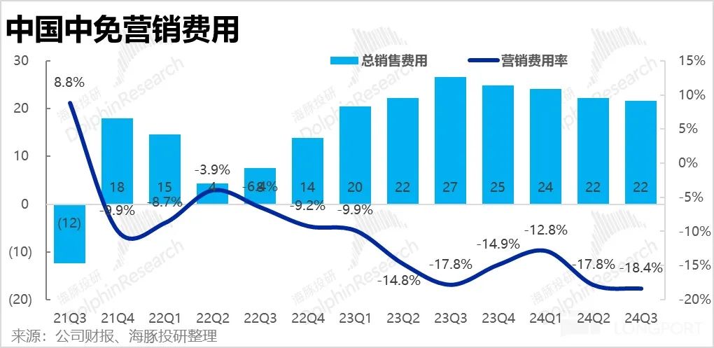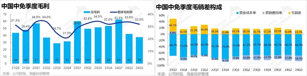 2.营收加速下滑外,让问题更严重的是,中免的毛利率本季也环比缩窄了 1.9pct,毛利润额同比减少 27%,下跌幅度较营收进一步放大。而营销费尽管同比减少了超 5 亿元(-19%)。但由于收入跌幅更大,营销费率因分母走低、反而环比增长了 0.6pct。最终使得毛销差利润率环比下降了整整 2.5pct 到 13.7%,毛销差额同比下滑了 36%,超 1/3。消费不景气导致毛利承压收缩的同时,又必须维持营销投入以吸引客户,陷入了进退两难的恶性循环。