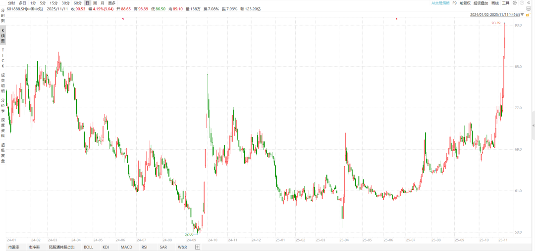 10月底以来,中国中免(601888)从70元左右一路上涨,最高涨至今日盘中的93.39元,本周一更是放量涨停,带动白酒、食品饮料等一众消费股大反弹。