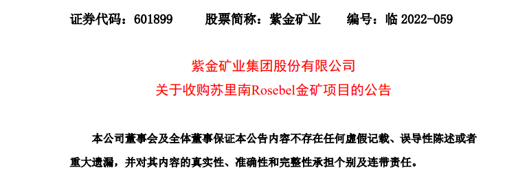 10月18日晚公司公告,将通过境外全资子公司Silver Source Group Limited出资3.6亿美元(约合人民币25.59亿元),收购IMG持有的Rosebel Gold Mines N.V. 95%的A类股份股权和100%的B类股份股权,后者拥有苏里南Rosebel金矿项目,为南美洲最大的在产金矿之一。