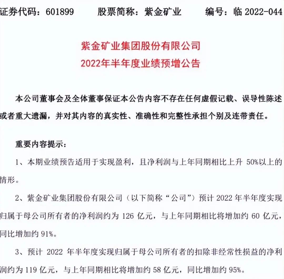 据财报显示,2022年上半年公司营收1324.58亿元,同比增长20.57%,归母净利润126.3亿元,同比增长89.95%。紫金矿业半年报业绩保持高增长,主因铜金矿产业务贡献较大增幅。