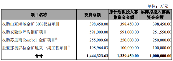 扣除发行费用后,募集资金净额拟投资于收购山东海域金矿30%权益项目、收购安徽沙坪沟钼矿项目、收购苏里南Rosebel金矿项目、圭亚那奥罗拉金矿地采一期工程项目。