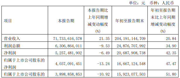 今年第三季度,紫金矿业营业收入为717.34亿元,同比增长21.35%;归属于上市公司股东的净利润为40.37亿元,同比减少13.24%;归属于上市公司股东的扣除非经常性损益的净利润为38.99亿元,同比减少10.92%。