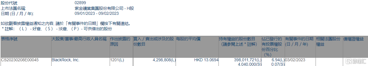 根据联交所最新权益披露资料显示,2023年2月3日,紫金矿业(02899.HK)遭BlackRock, Inc.在场内以每股均价13.0694港元减持好仓429.88万股,涉资约5618.28万港元。