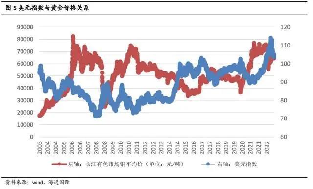 2023 年看空美元指数,铜价有望缓慢上行。美联储紧缩预期预计于 2023 年 H1 结束,美元吸引力减弱,对应美元指数掉头向下。同时,中国经济复苏预期加强,对外资吸引力逐步增加,制造业、航空业、服务业等行业回暖,美元吸引力不再。