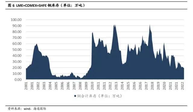 铜库存处于历史低位,给予铜价支撑。近十年来,铜三地合计库存量于 2018 年 3 月达到高峰,超过 90 万吨,于 2021 年 11 月跌至最低点 17.7 万吨左右。