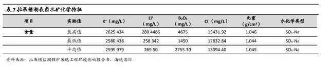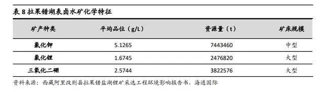 拉果错盐湖平均锂浓度 270 毫克/升,保有资源量折碳酸锂 214 万吨,且由于是湖水中含锂,其资源量即可视为储量,且镁锂比较低,仅有 3.32,资源质量较好;除锂外,还可对卤水中富含的硼、钾、石盐、镁盐、铷、铯等资源进行综合利用。
