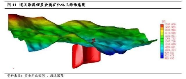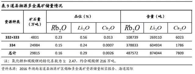 根据 2016 年湖南省道县湘源矿区锡铷多金属矿资源储量核实报告,道县湘源锂多金属矿资源量总计达到 29815 万吨矿石,氧化锂的品位达到 0.29%,即 87.4 万吨氧化锂,约合碳酸锂 216 万吨。