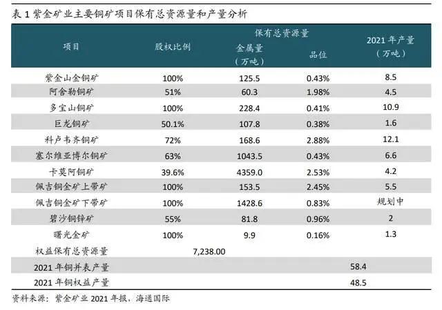 公司黄金、铜等金属资源储量居全球前列,我们预计公司主要项目能够顺利投产。根据公司公告相关规划,我们预测 2022、 2023 和 2025 年矿产铜为 86/95/117 万吨,矿产金为 56/72/90 吨,2023、2025 年碳酸锂产量分别为 0.3、12 万吨。