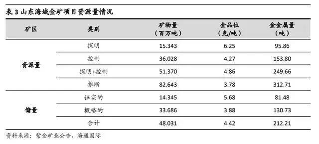 山东海域金矿位于胶东地区一级成矿带三山岛-仓上断裂成矿带,依据 JORC 标准,海域金矿保有黄金资源量为 562.37 吨,平均品位 4.20 克/吨,其中储量为 212.21 吨,平均品位为 4.42 克/吨。