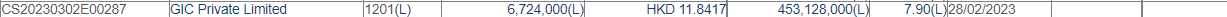 减持后,GIC Private Limited最新持股数目为453,128,000股,持股比例由8.02%下降至7.90%。