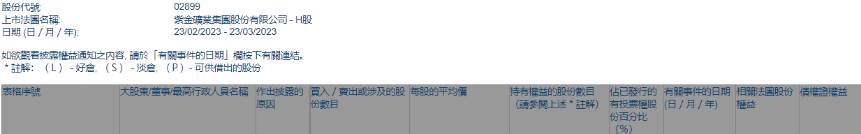 根据联交所最新权益披露资料显示,2023年3月17日,紫金矿业(02899.HK)获Van Eck Associates Corporation在场内以每股均价12.04港元增持2646.8万股,涉资约3.19亿港元。