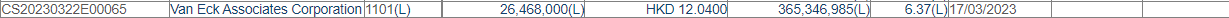 增持后,Van Eck Associates Corporation最新持股数目为365,346,985股,持股比例由5.91%上升至6.37%。