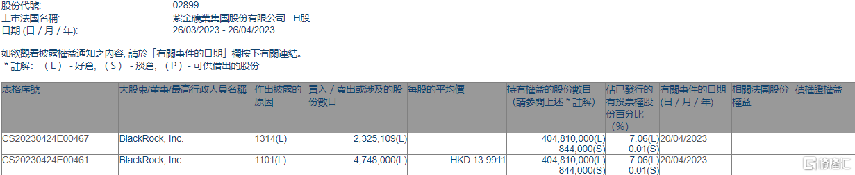 格隆汇4月26日丨根据联交所最新权益披露资料显示,2023年4月20日,紫金矿业(02899.HK)获BlackRock, Inc.在场内以每股均价13.9911港元增持好仓474.8万股,涉资约6643万港元。