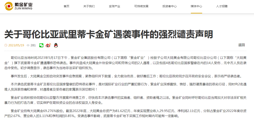 针对此次爆炸袭击事件,5月19日凌晨,紫金矿业官方网站发布《关于哥伦比亚武里蒂卡金矿遇袭事件的强烈谴责声明》,《声明》称本次袭击事件,是对国际矿业行业的严重犯罪行为,紫金矿业深感震惊、愤怒,强烈谴责暴徒的恶劣行径,同时向2名遇难人员深表悲痛和哀悼,对遇难者及受伤者的家属表示深切慰问。