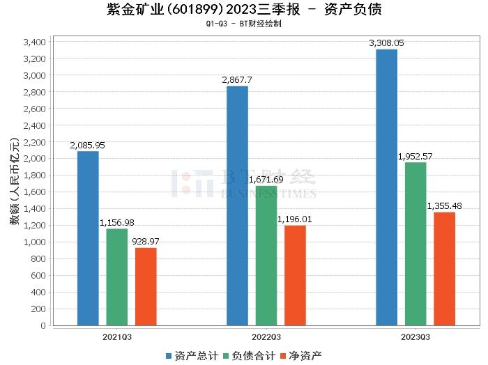 在资产负债方面,紫金矿业2023年三季度的总资产为3308.05亿元,相较于上年度末的3060.44亿元有所增长。负债合计为1952.57亿元,略高于上年度末的1815.89亿元。公司的净资产为1355.48亿元,较上年度末的1244.55亿元有所提升。资产负债率为59.02%,与上年度末的59.33%相比略有下降。