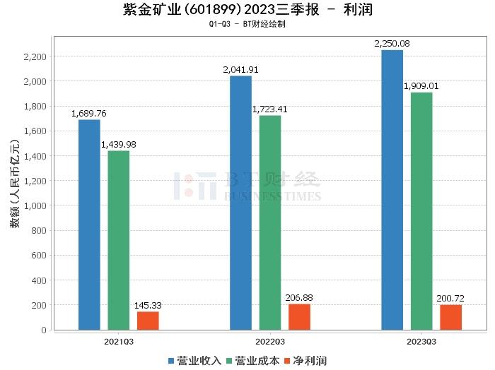 在利润方面,紫金矿业2023年三季度的营业收入为2250.08亿元,较上年同期的2041.91亿元有所增长。营业利润为243.21亿元,略低于上年同期的251.53亿元。营业成本为1909.01亿元,较上年同期的1723.41亿元有所增加。净利润为200.72亿元,略低于上年同期的206.88亿元。