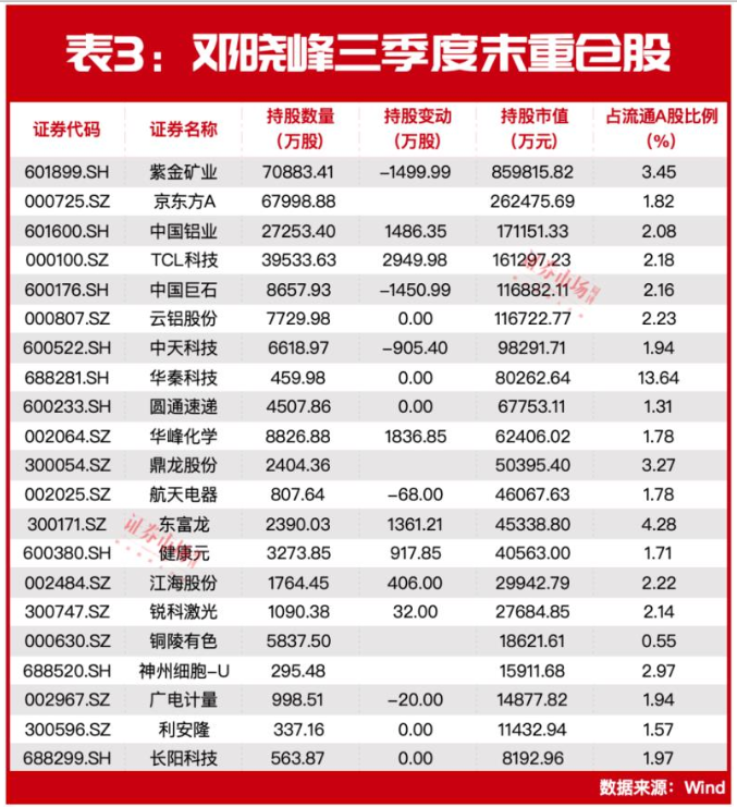 对于该表格,有人关注的是邓晓峰三季度大幅买入京东方A(000725)和TCL科技(000100),不过笔者更关注的还是榜首的紫金矿业(601899),因为笔者在邓晓峰2019年下半年3元多定增参与紫金矿业后,2020年也曾经跟随买入过,但2020年稍有盈利便迅速在5元多撤离,卖太早了,后悔了很长一段时间!