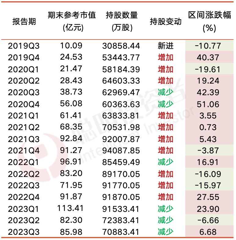 从2019年下半年进入后,邓晓峰一直是绝对重仓。此后几年除了2021年三季度、2022年一季度和今年以来进行减持外,均在不停加码。