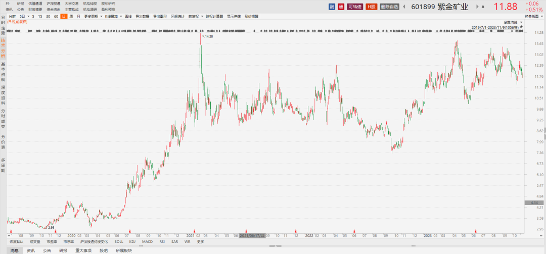 紫金矿业可以说是一只神奇的股票,曾经长期低价、股本大、散户多,但从2020年起势之后,便长期在两位数运行。