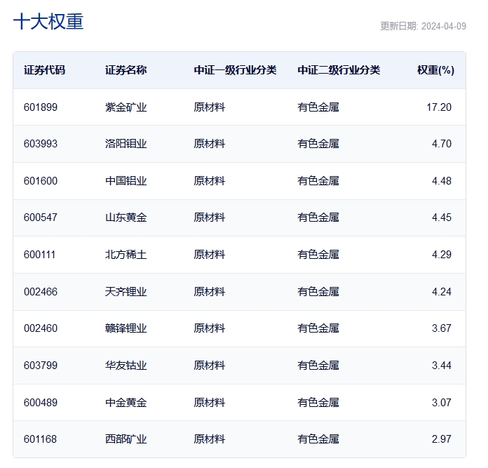 看好未来贵金属及大宗工业金属周期回归,同指数下规模最大的有色50ETF(159652)备受关注。数据显示,截至2024年4月9日,中证细分有色金属产业主题指数(000811)前十大权重股分别为紫金矿业(601899)、洛阳钼业(603993)、中国铝业(601600)、天齐锂业(002466)、北方稀土(600111)、山东黄金(600547)、赣锋锂业(002460)、华友钴业(603799)、中金黄金(600489)、西部矿业(601168),前十大权重股合计占比超53%。