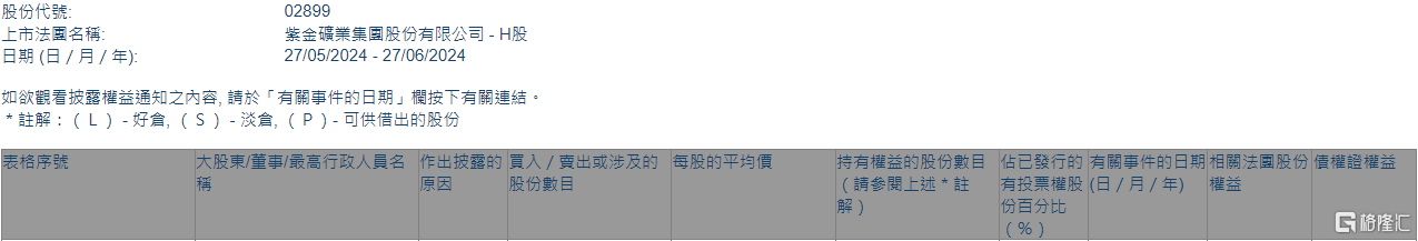 格隆汇6月27日丨根据联交所最新权益披露资料显示,2024年6月20日,紫金矿业(02899.HK)遭JPMorgan Chase & Co.以每股均价16.69港元减持好仓899.94万股,涉资约1.50亿港元。