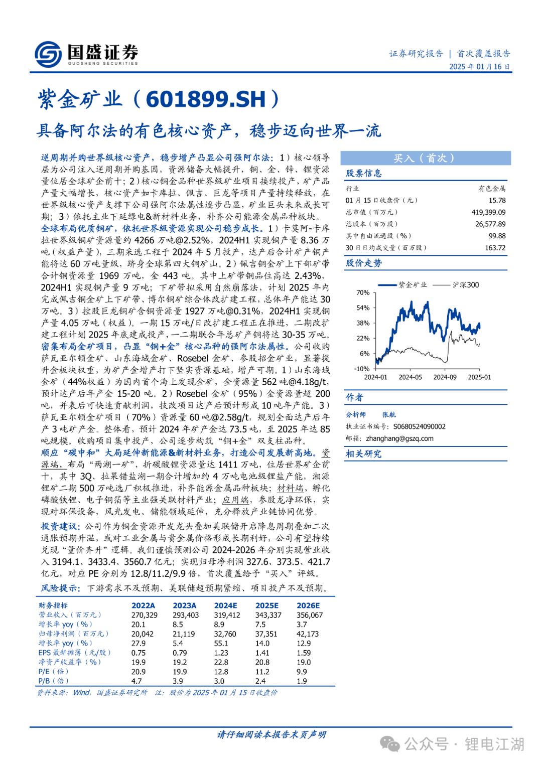 投资建议:公司作为铜金资源开发龙头叠加美联储开启降息周期叠加二次通胀预期升温,或对工业金属与贵金属价格形成长期利好,公司有望持续兑现“量价齐升”逻辑。我们谨慎预测公司2024-2026年分别实现营业收入3194.1、3433.4、3560.7亿元;实现归母净利润327.6、373.5、421.7亿元,对应PE分别为12.8/11.2/9.9倍,首次覆盖给予“买入”评级。