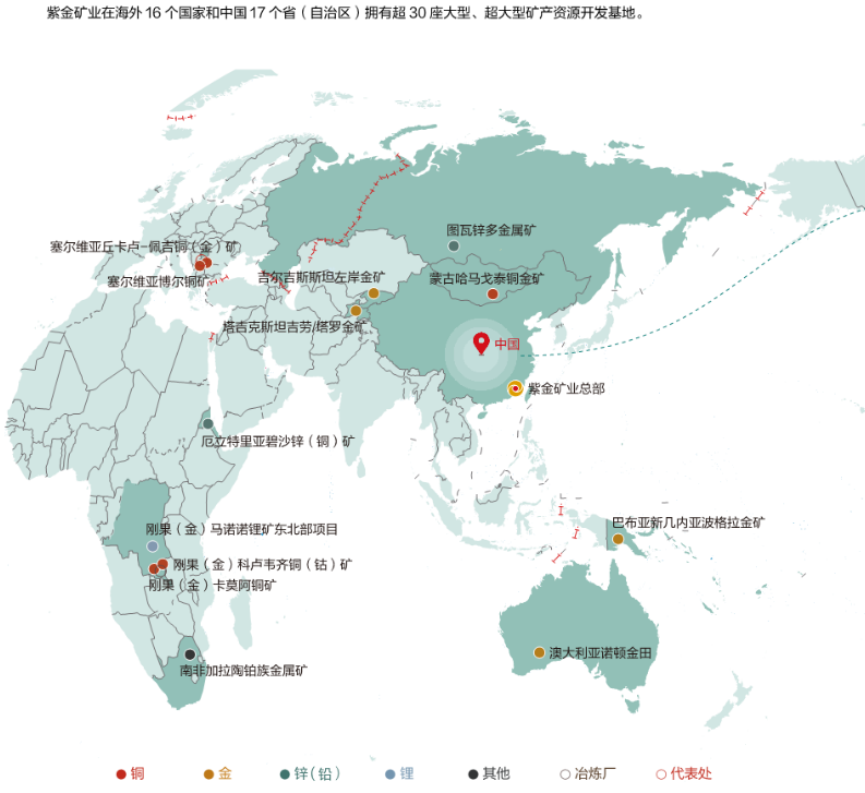 数据显示,截至2024年年末,紫金矿业在海外16个国家和中国17个省(自治区)拥有超30座大型、超大型矿产资源开发基地。其中,公司矿产铜产量占全国总量的65%,矿产金产量占全国总量的24%。