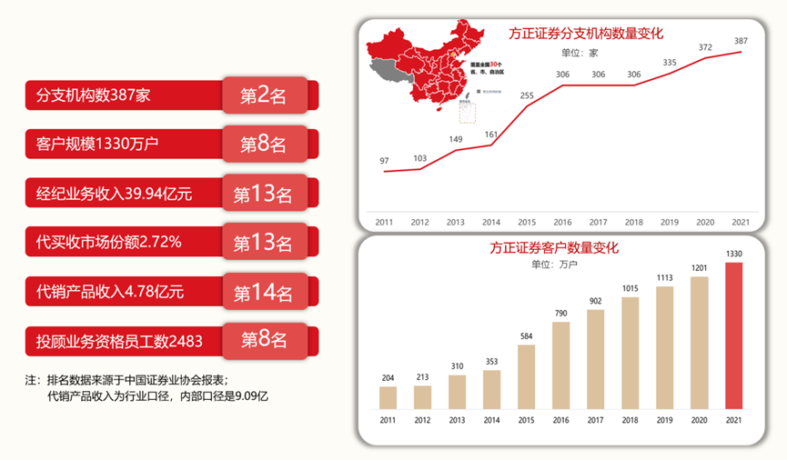 截至2021年年末,方正证券在全国30省、直辖市、自治区设立387家网点,位居行业第二。方正证券具有投顾资格员工数达到2483人,位居行业第八。