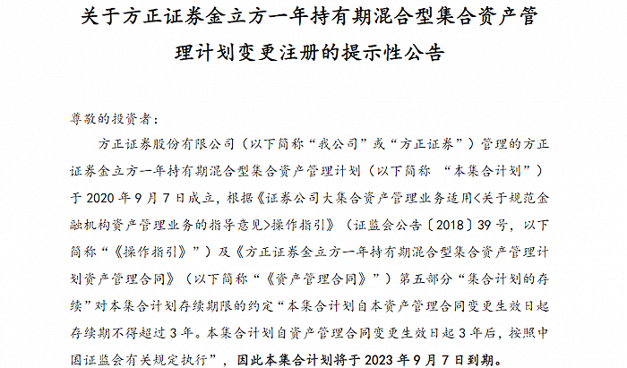 方正证券管理的方正证券金立方一年持有期混合型集合资产管理计划于2020年9月7日成立,按照证监会有关规定执行,该集合计划将于2023年9月7日到期。